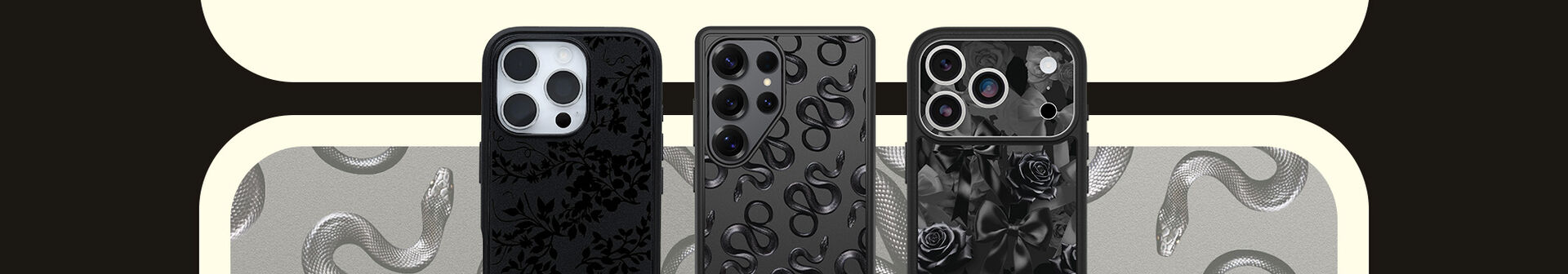 Conjure your dark side with goth-inspired phone cases that harken back to vintage black lace, textured serpent and black rose.